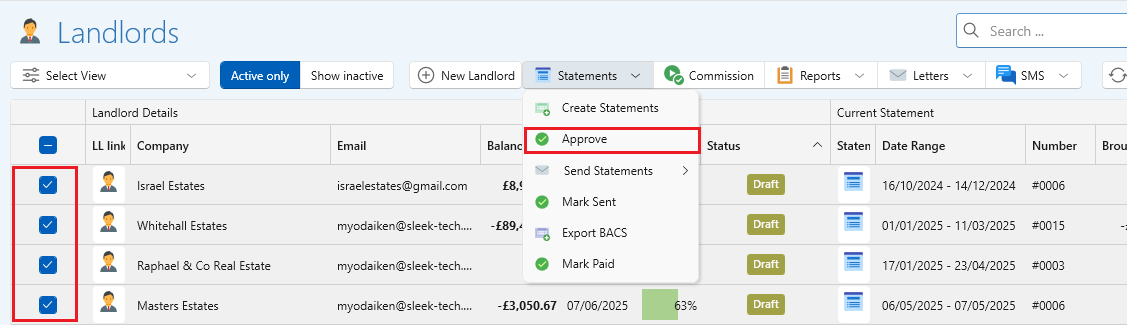 • Once approved, you can filter by Approved status to easily send or pay the statements.