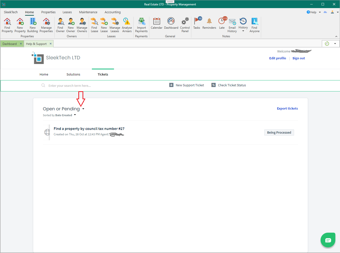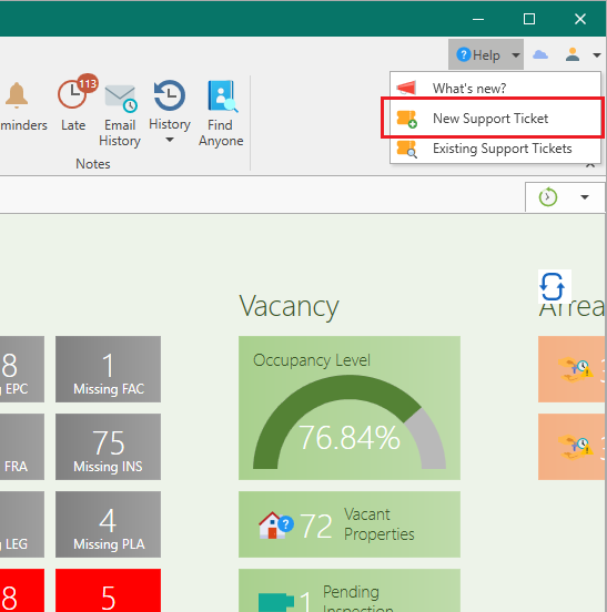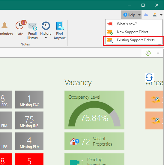 From the Help menu at the top right corner of the software select Existing Support Tickets.