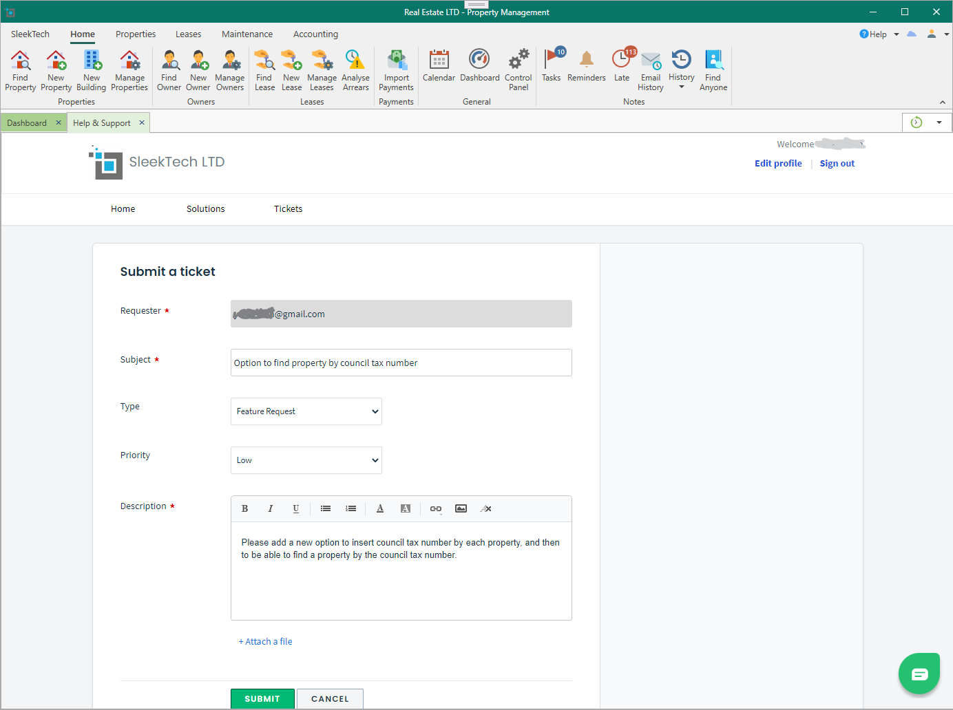 Type some more details of your request in the description box, and additionally, you can add any attachments or pictures to illustrate your request by clicking Attach a file underneath the description box.