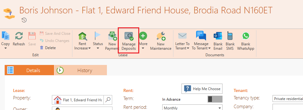 To create new deposit invoices or to view tenant deposit history click Manage Deposits on the tenancy page.