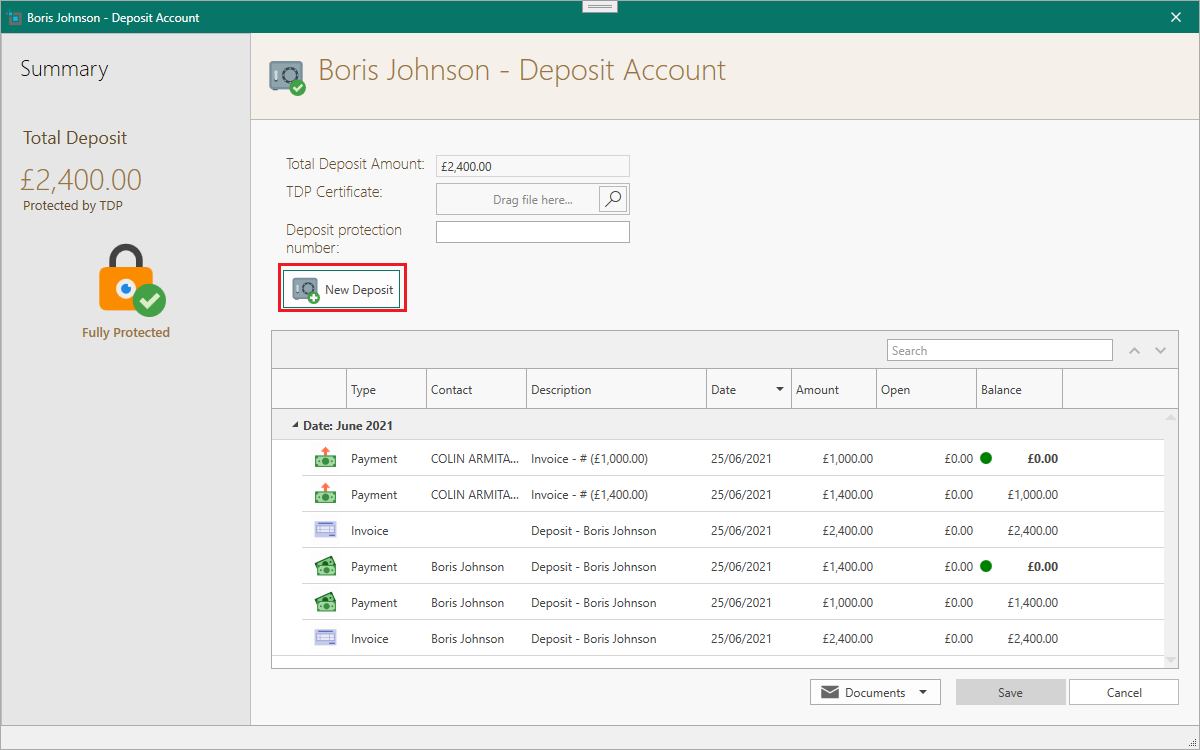 New window to manage tenant's deposits.
