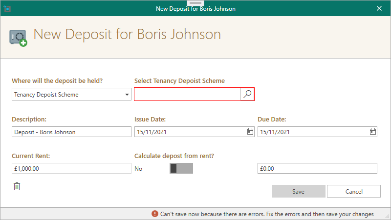 You can calculate the deposit from the rent i.e. rent is £1200, check Calculate deposit from rent, insert 1.5 in the textbox.