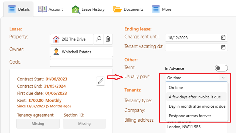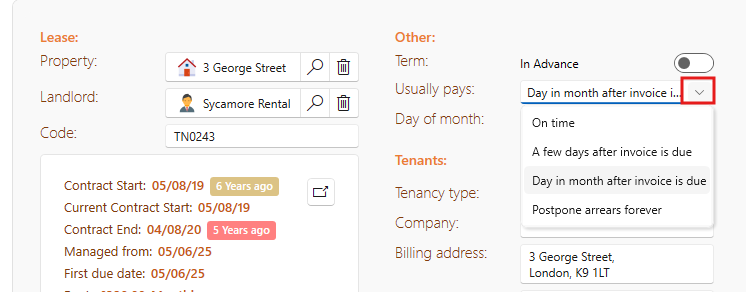 Whenever an invoice is created for a tenant, this selection will be taken in account and the expected date for the payment of that invoice will be calculated on that.