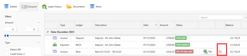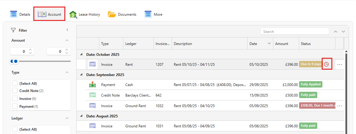 If an invoice is already past the due date, but payment isn't expected until a later time, it will be indicated in the account window with a clock icon as shown below.