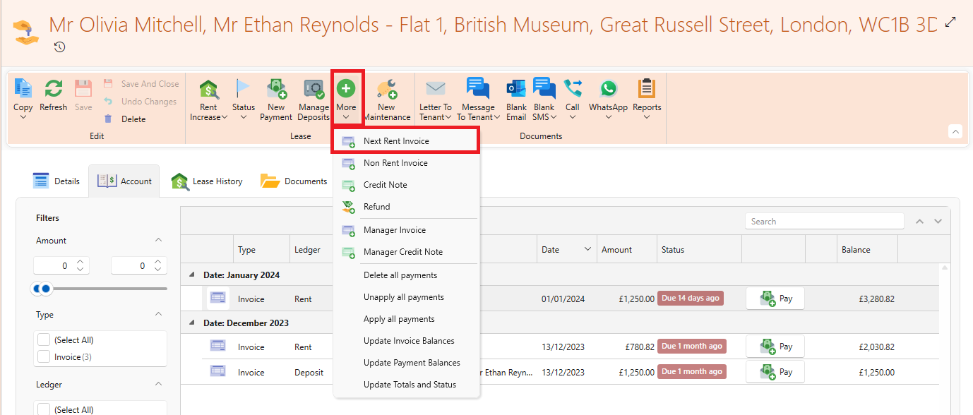 If a tenant has paid more rent than currently due in advance, you should create the next rent invoices so you can apply the payment to the future invoices.