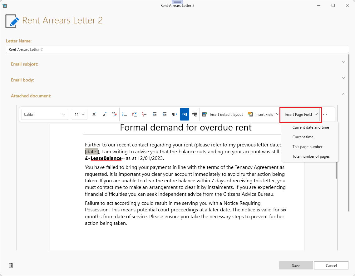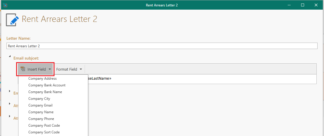 If you are editing a letter and not just an email, this means that in addition to the email body, there will also be an attached document and you will see two more sections in the letter editor.