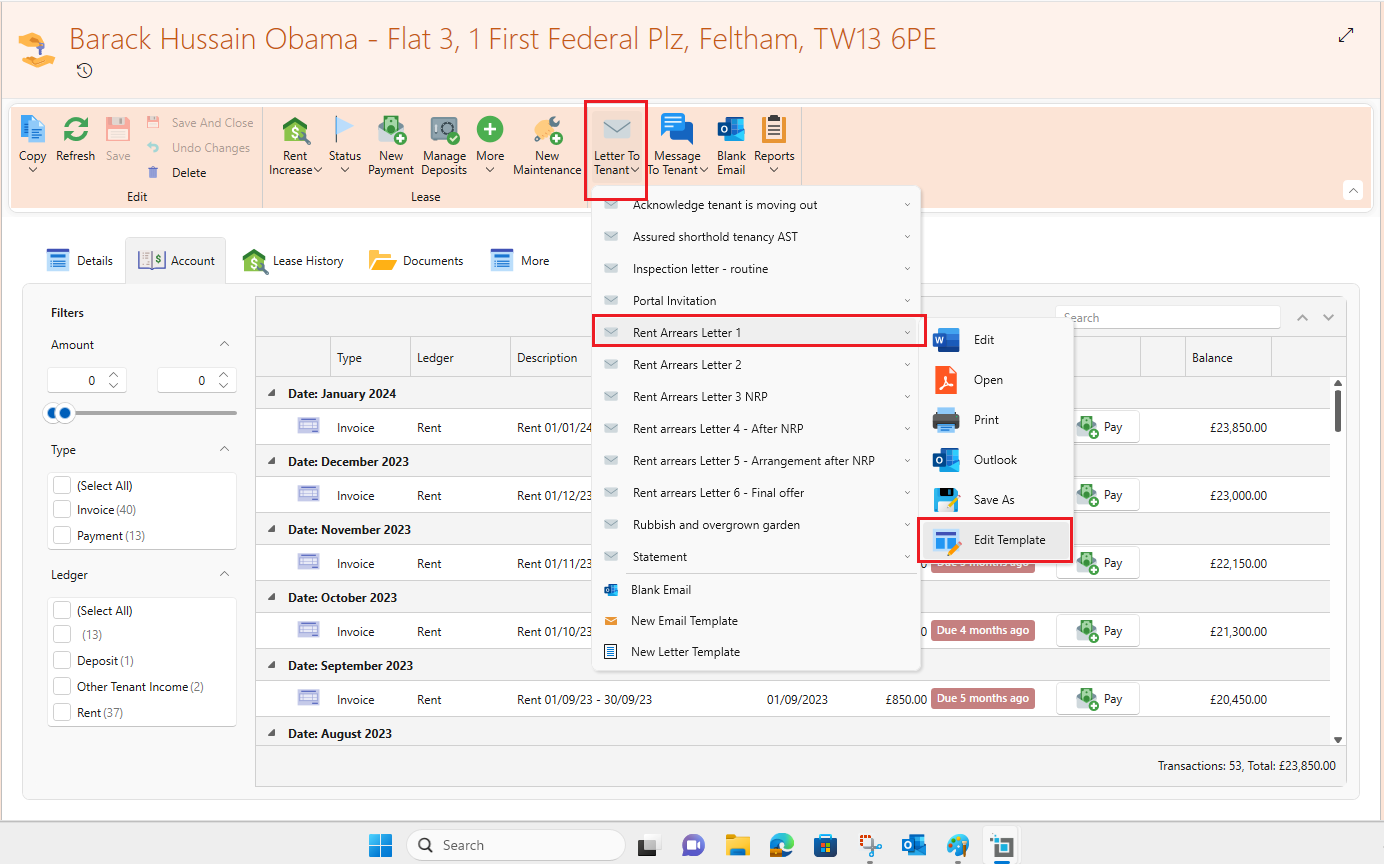 • You can open the letter editor from any letter menu as shown below: