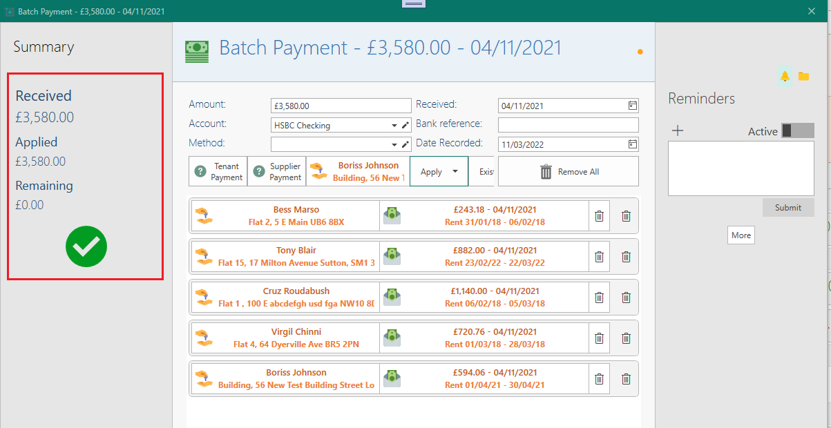 - You can do this for multiple tenants until the total of all payments match the payment amount.