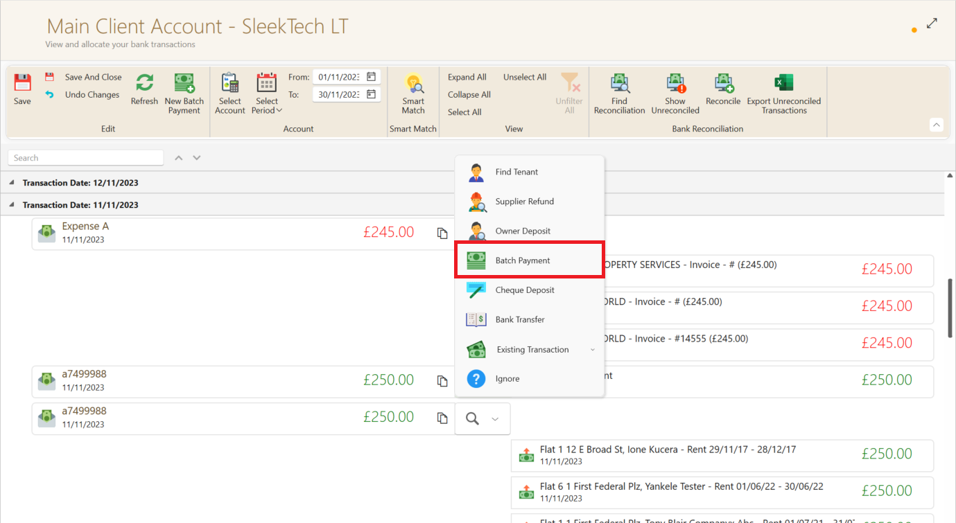 - Click the search button next to the payment and select Batch Payment from the dropdown.