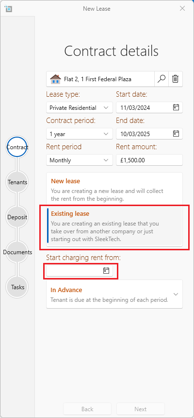 - Click on Existing lease. The Start changing rent from box will by default become empty for you to fill in the correct date you want to start charging rent from on your system.