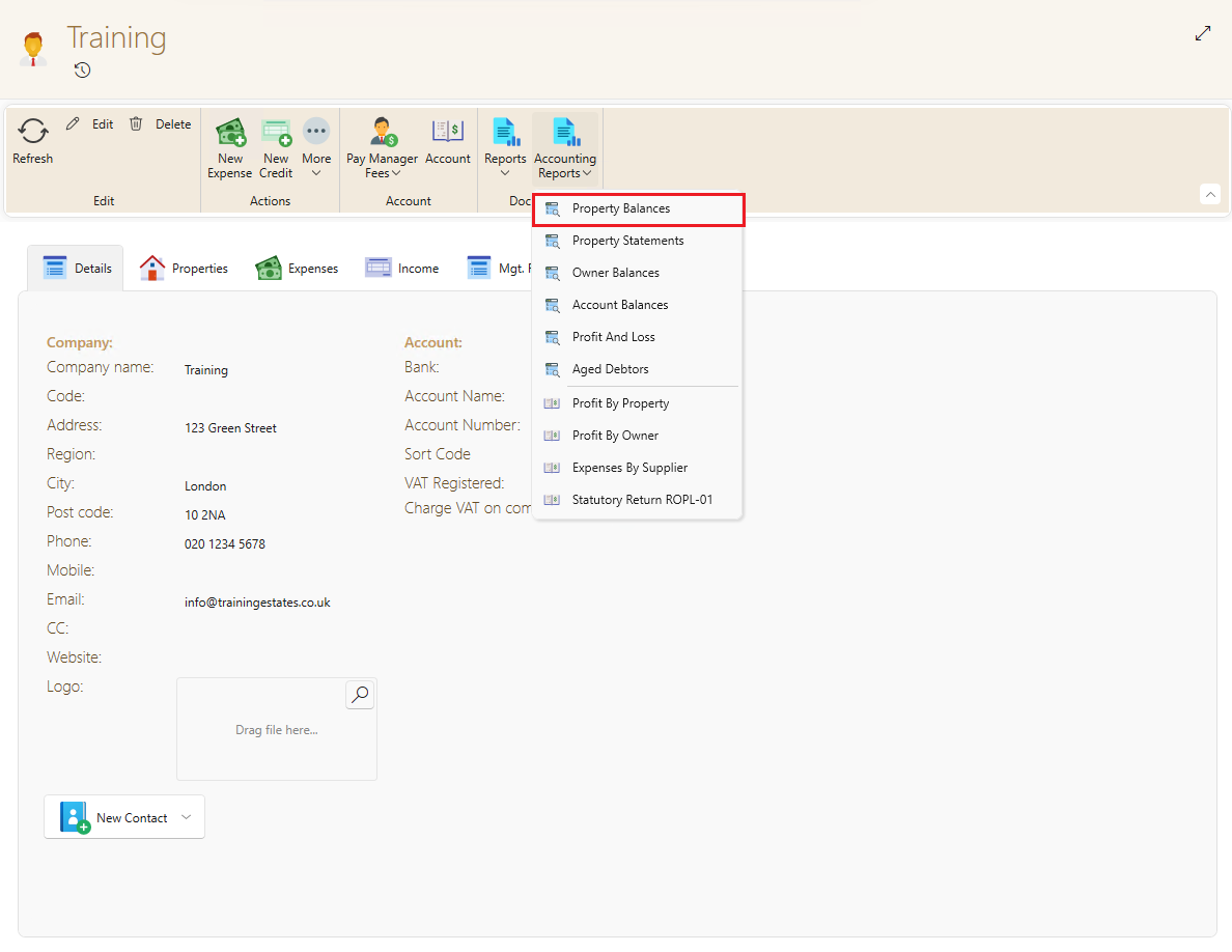 - You will get a dropdown with different reports, click on property balances.