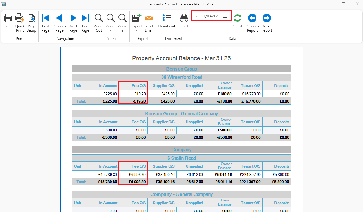 - Under the Fee column you will see a total fee collected for the specified period for each property.