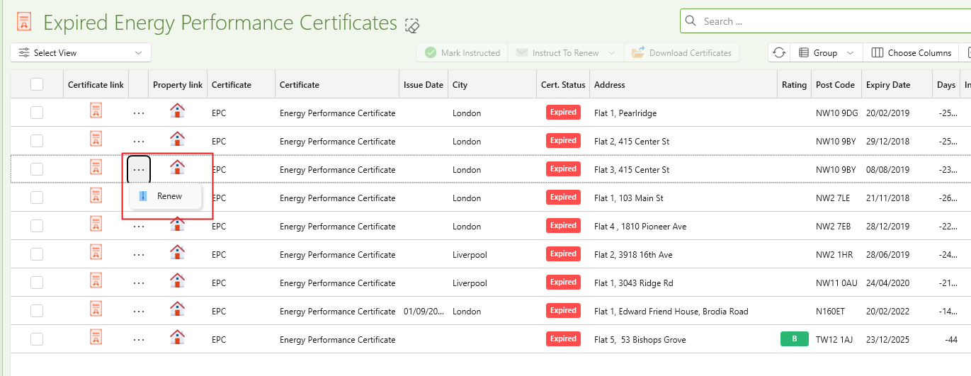 When viewing the list of certificates by clicking into any of the cards you can aslo quickly renew any certiifcates firectly from that window.