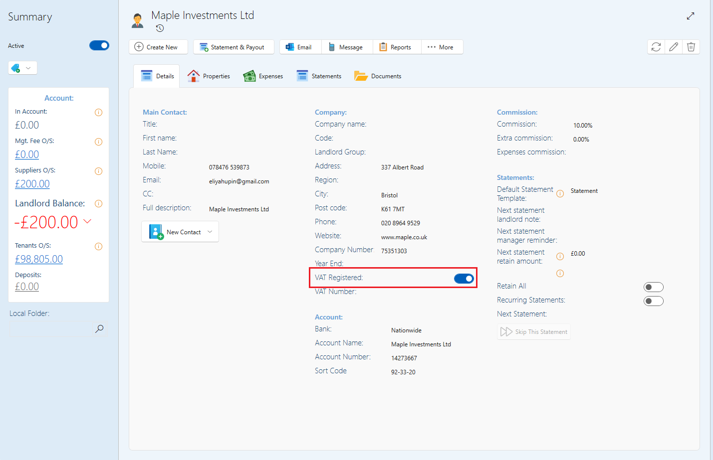 - Switch on the toggle for VAT registered. You will need to switch this on even if not all the properties under this owner will be charged VAT. (Each property will be switched on separately.)