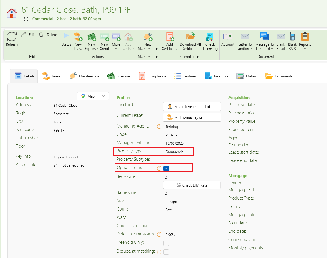 (Please note that Option to Tax can only be enabled on buildings that are set to Commercial or Mixed Use, as these building types include commercial elements (for example, a shop with residential units above)).