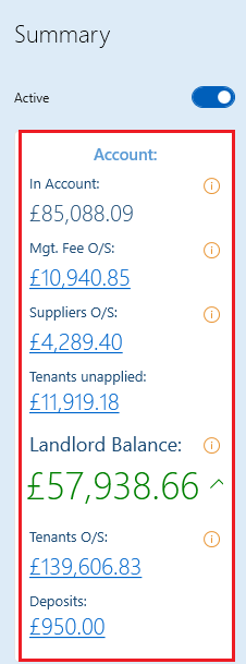 - Landlords Balance = In Account - Fee O/S - Supplier O/S -Deposits - Unapplied.