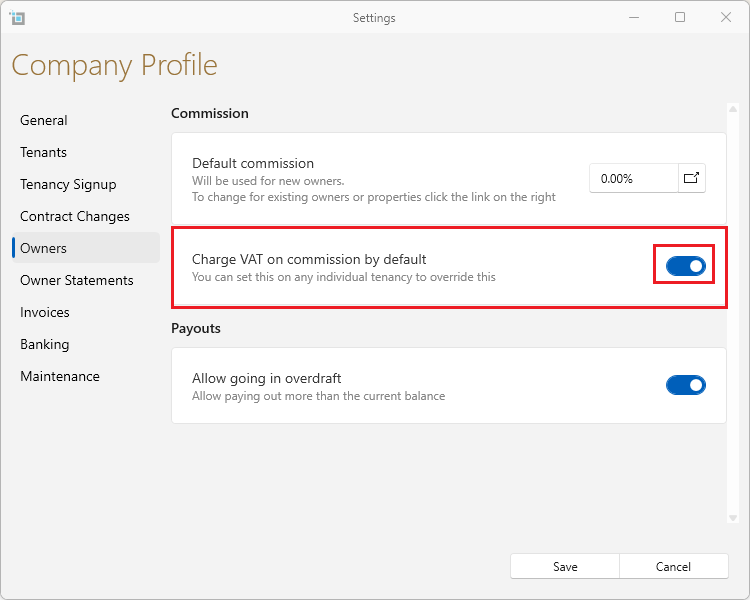 - For "Charge VAT on commission by default" Slide the toggle to the on position
