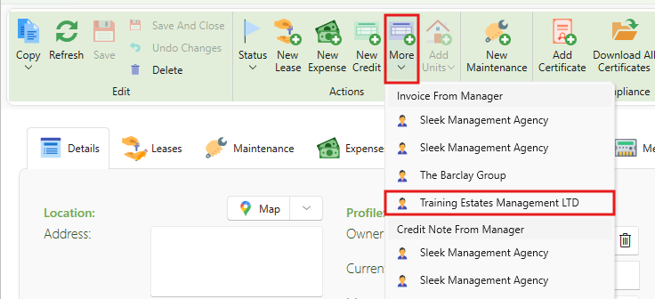 - This will open a new invoice from your management company to the property owner.
