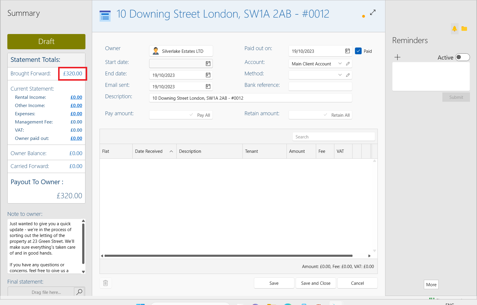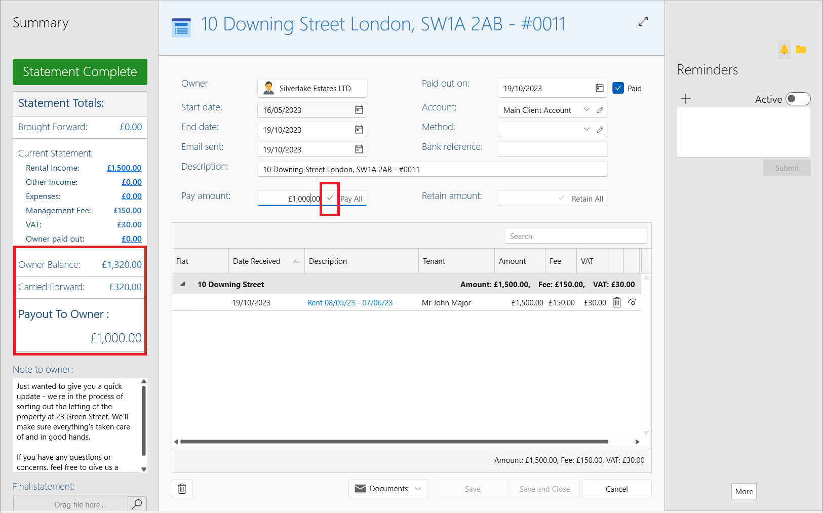 The correct amount owed to the owner was £1320 however you mistakenly sent only £1000 to the owner. You then sent out another payment of £320