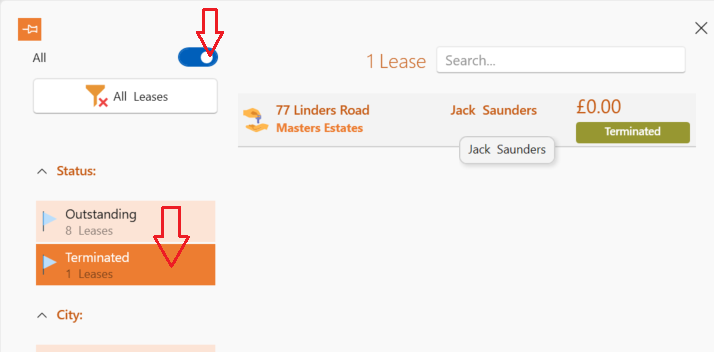- Click on the Terminated status in order to filter your search to just non active leases.