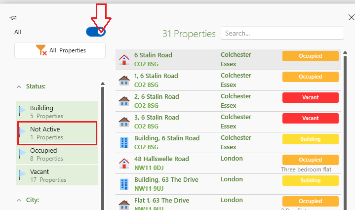 - Click on the Not Active status in order to filter your search to just non active properties.