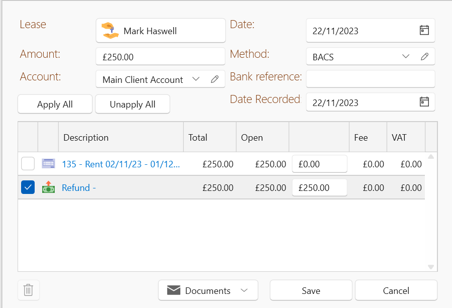 - When the payment clears, apply it to the refund, not to the next rent invoice.