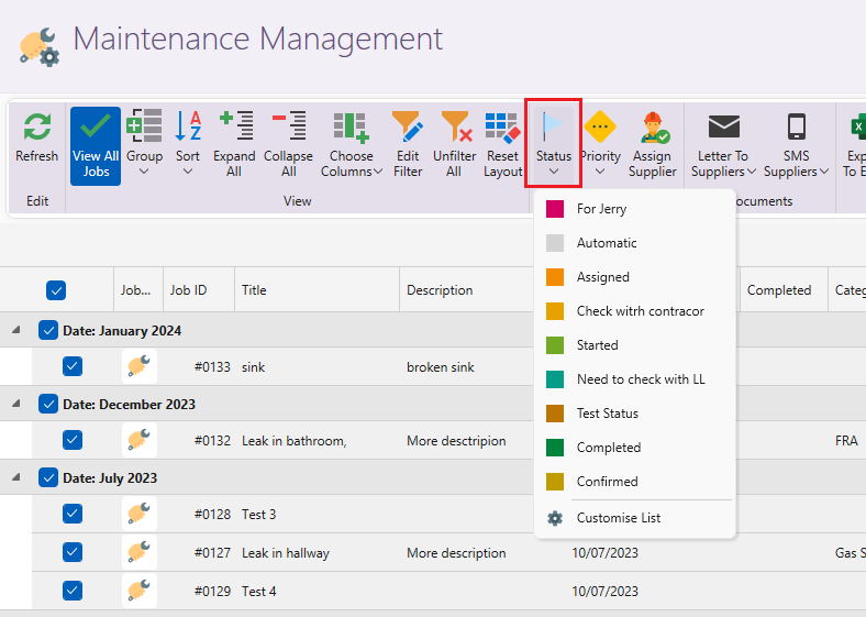 - You can also mark many jobs as completed or change to a different status by clicking on Status and then selecting the correct one.