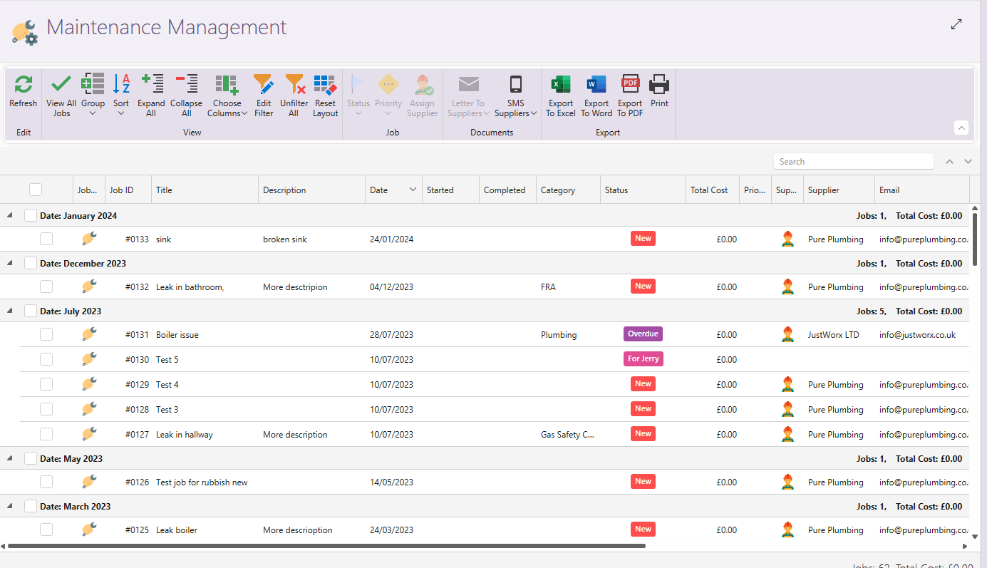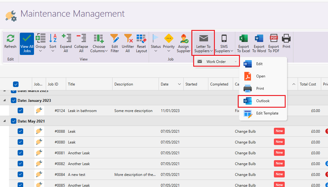 - To send an email to the suppliers with a list of all jobs, click on Letters to Suppliers from the page ribbon, then on Work order and then on Outlook.