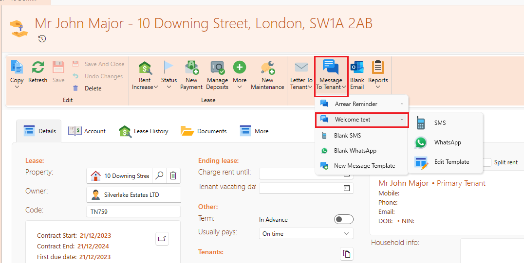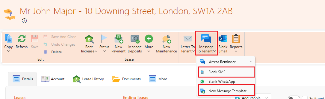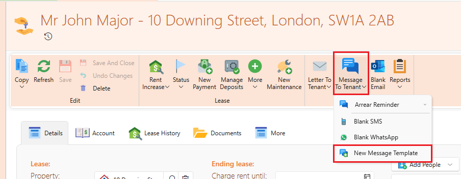 - On the owner or lease page, click on Message to Tenant/Message to Owner from the page ribbon.