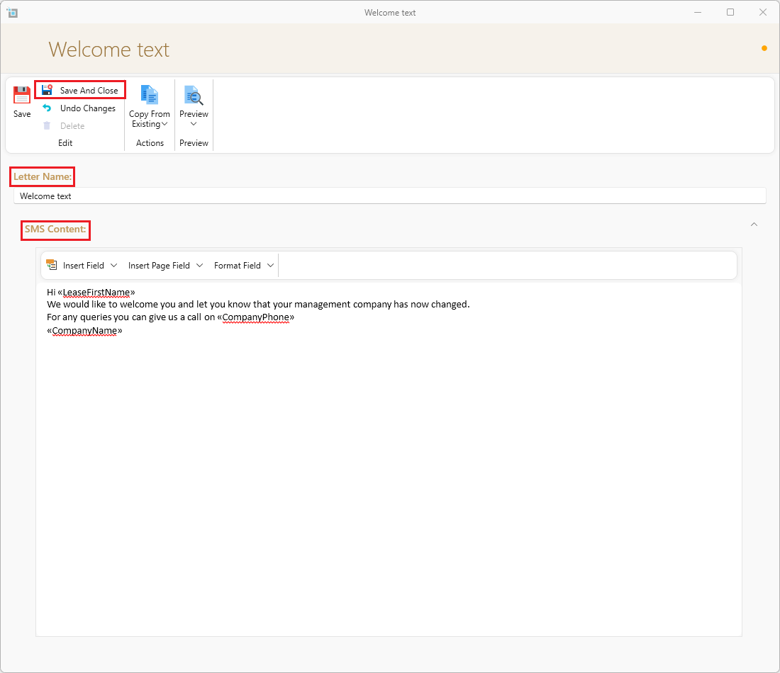 - Under Letter name you can put in the name of this SMS template. This is what will appear on the dropdown for you as a reference but will not be seen by the tenant or owner.