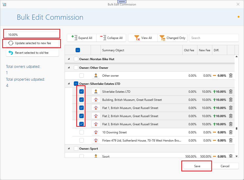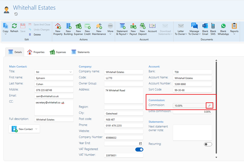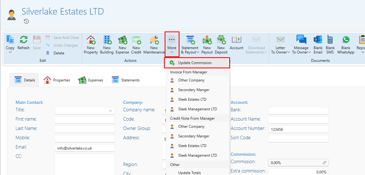 The update commissions window can further be accessed from the owners page by selecting> More > Update Commissions.