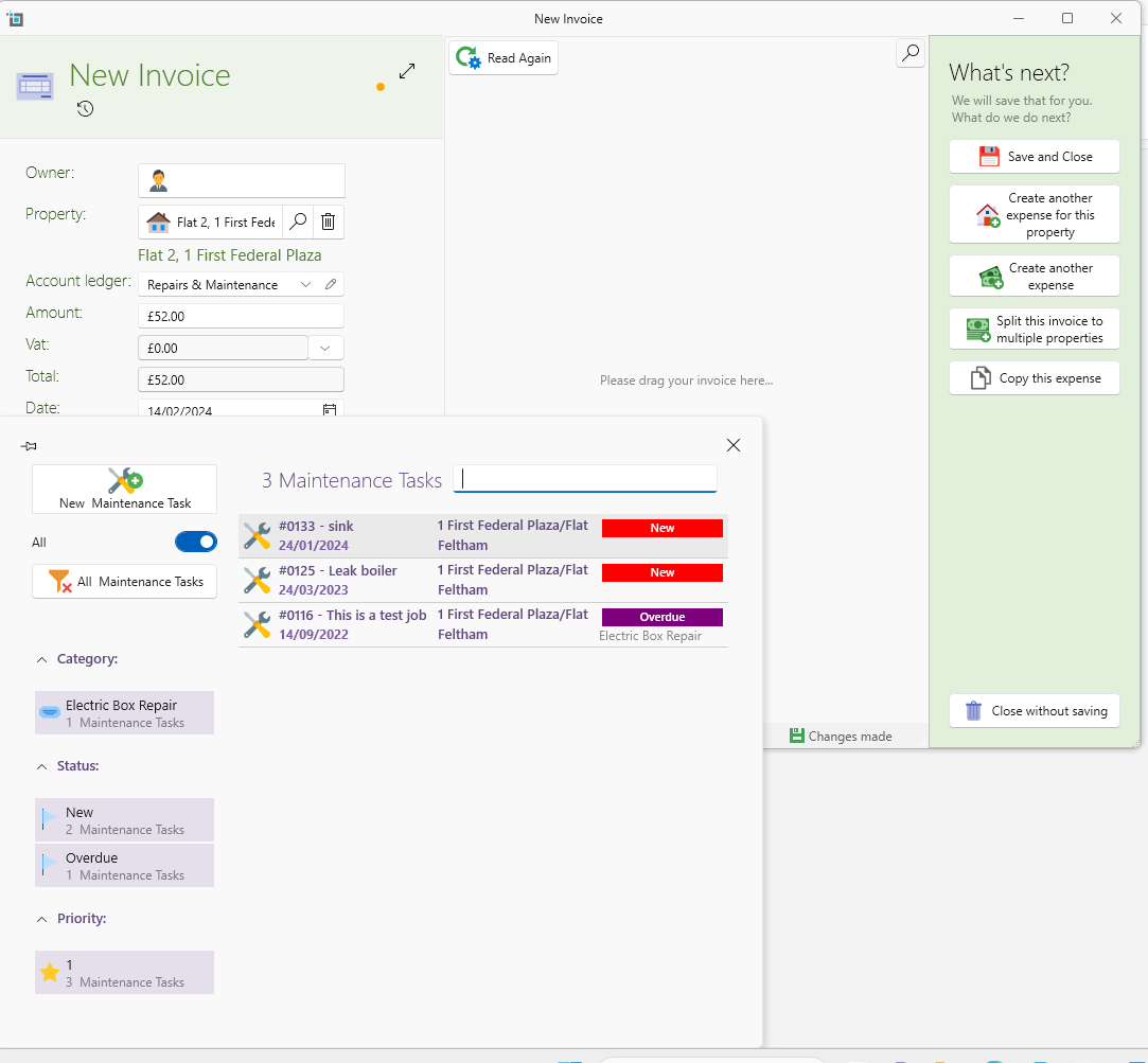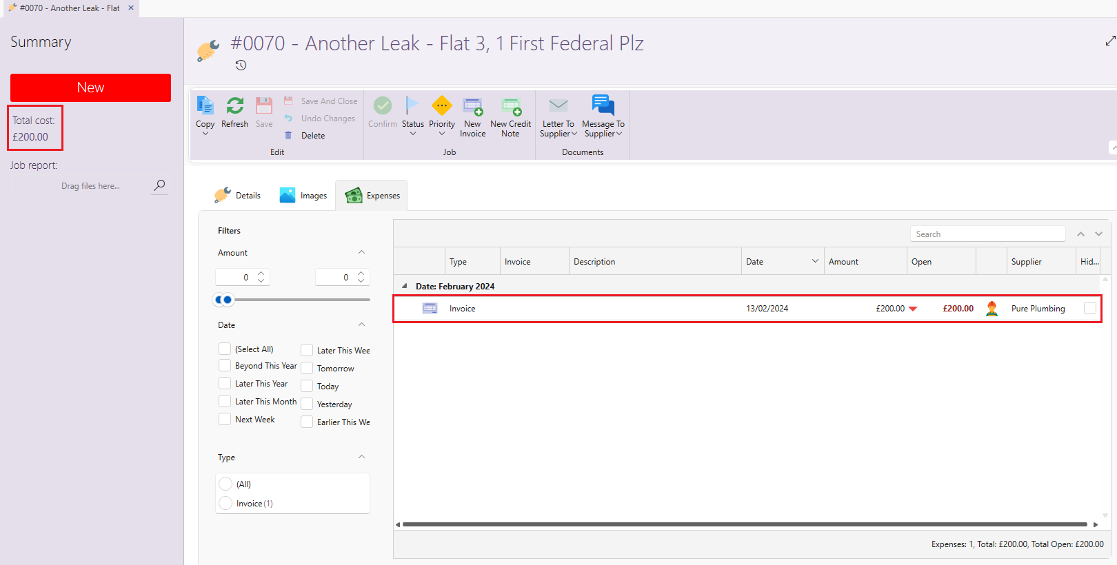 - When you click on Refresh, the job will now show with the amount at the side under the Status. On the Expenses tab you will see the invoice. You can also find the invoice on the property or under the Supplier.