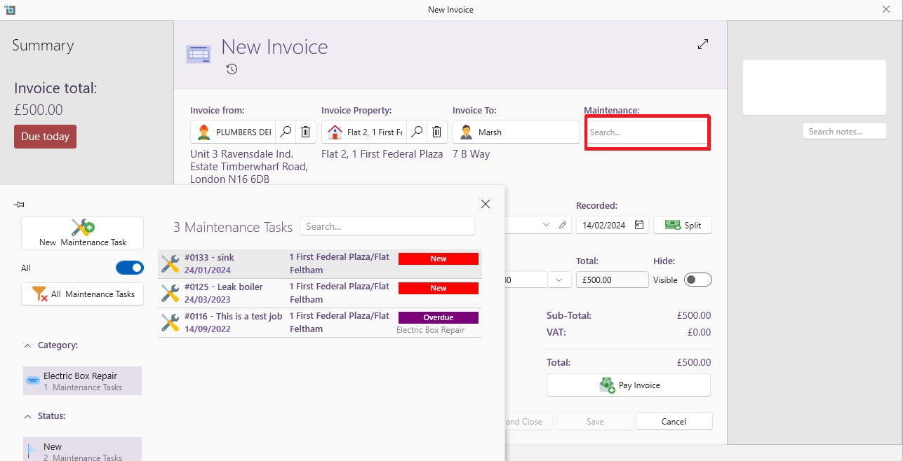 - The maintenance job will open. Click on New invoice from the page ribbon