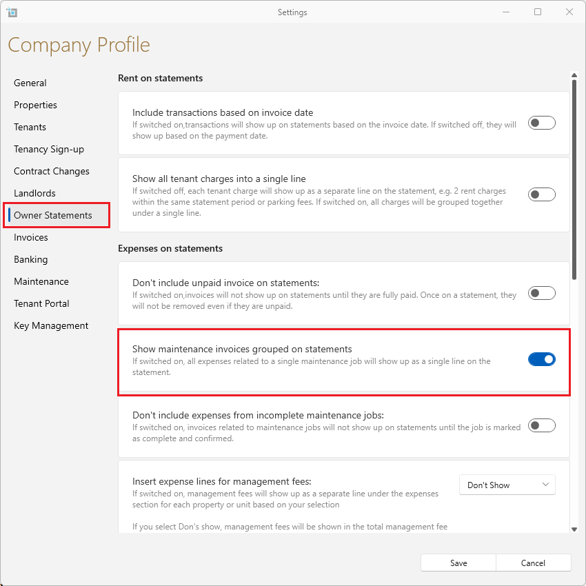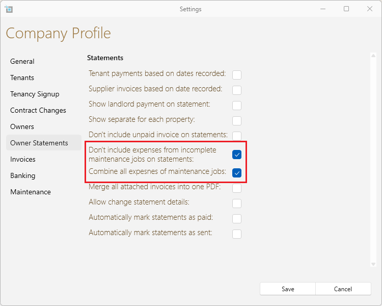 To change these settings go to Control panel, then to Settings and then Owner statements and check the settings as shown below.
