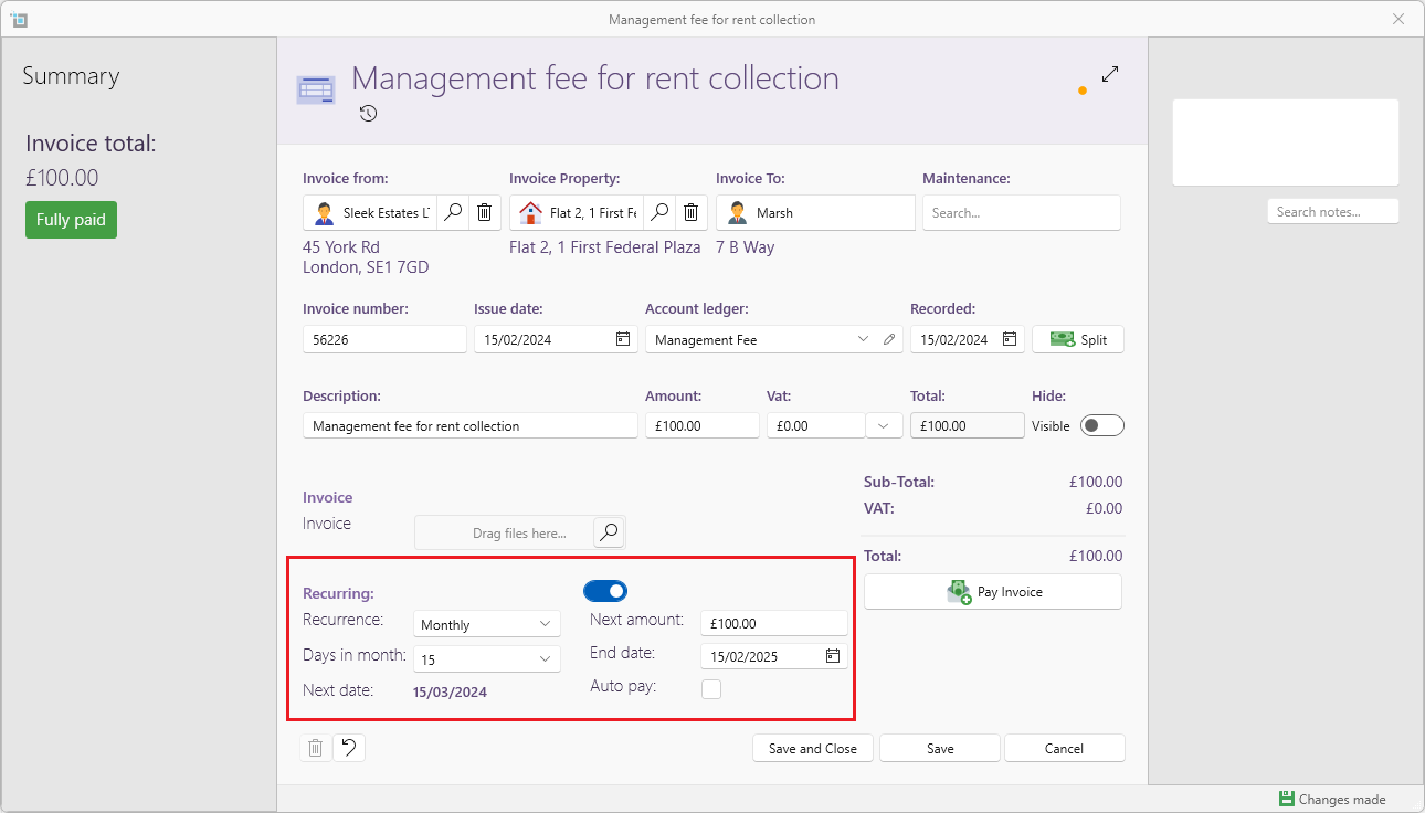 - Switch on the Recurring button and put in the details of this recurring charge.