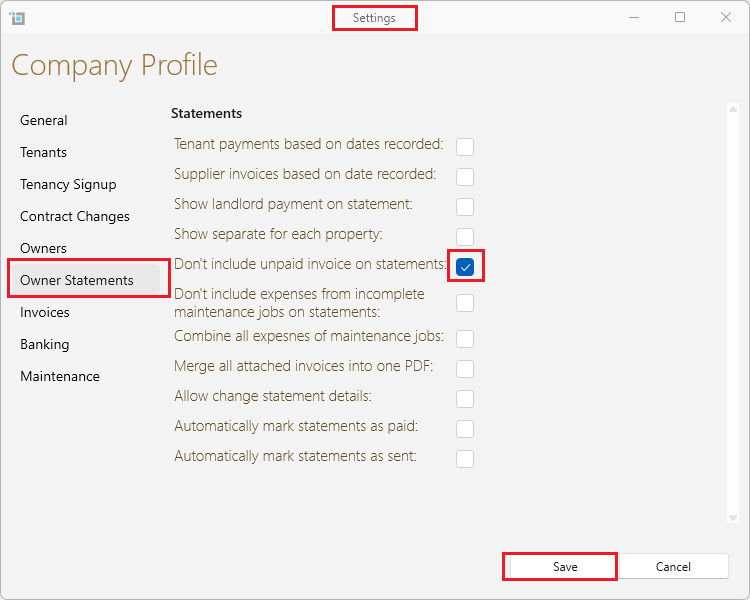 Once you have saved this option  Supplier invoices will only show up in the owner statement once they have been fully paid.