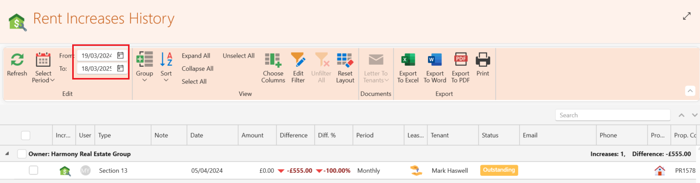 The Rent Increases management window enables you to see an overview of your rent changes.