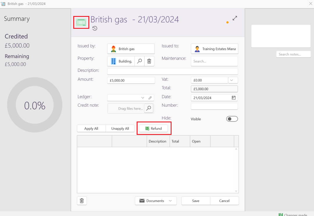 - Click open the credit note. (this can be found on the management page under the expenses tab)