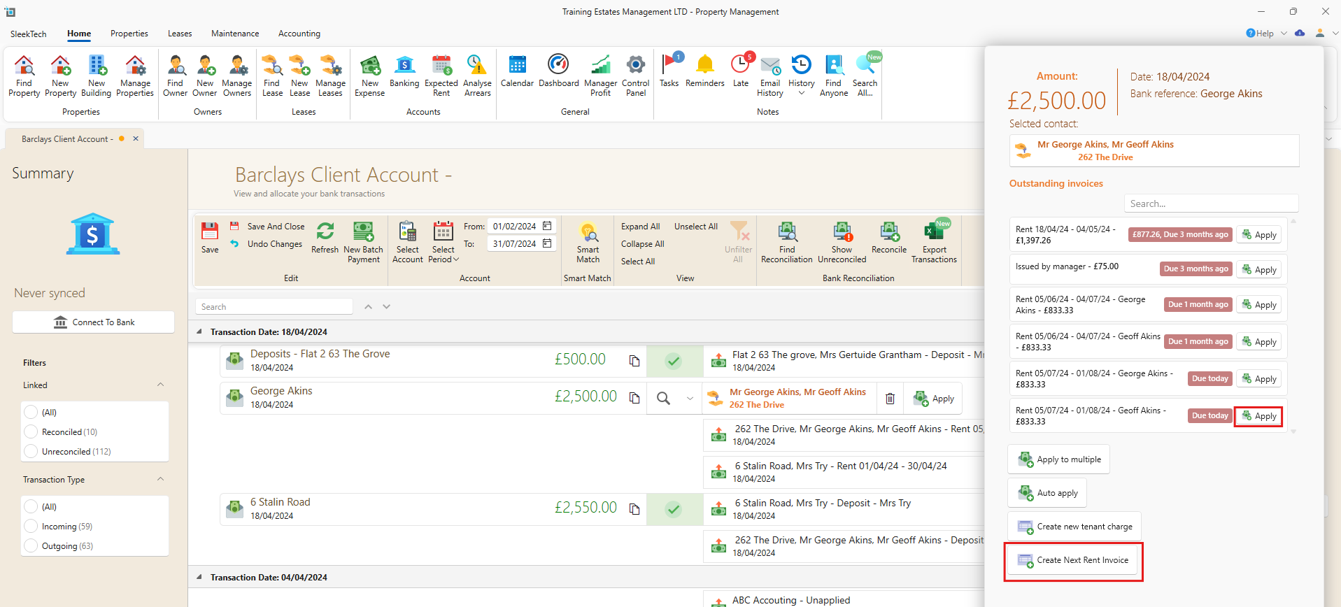 Within the side panel options, select Create Next Rent Invoice and apply the excess payment accordingly.