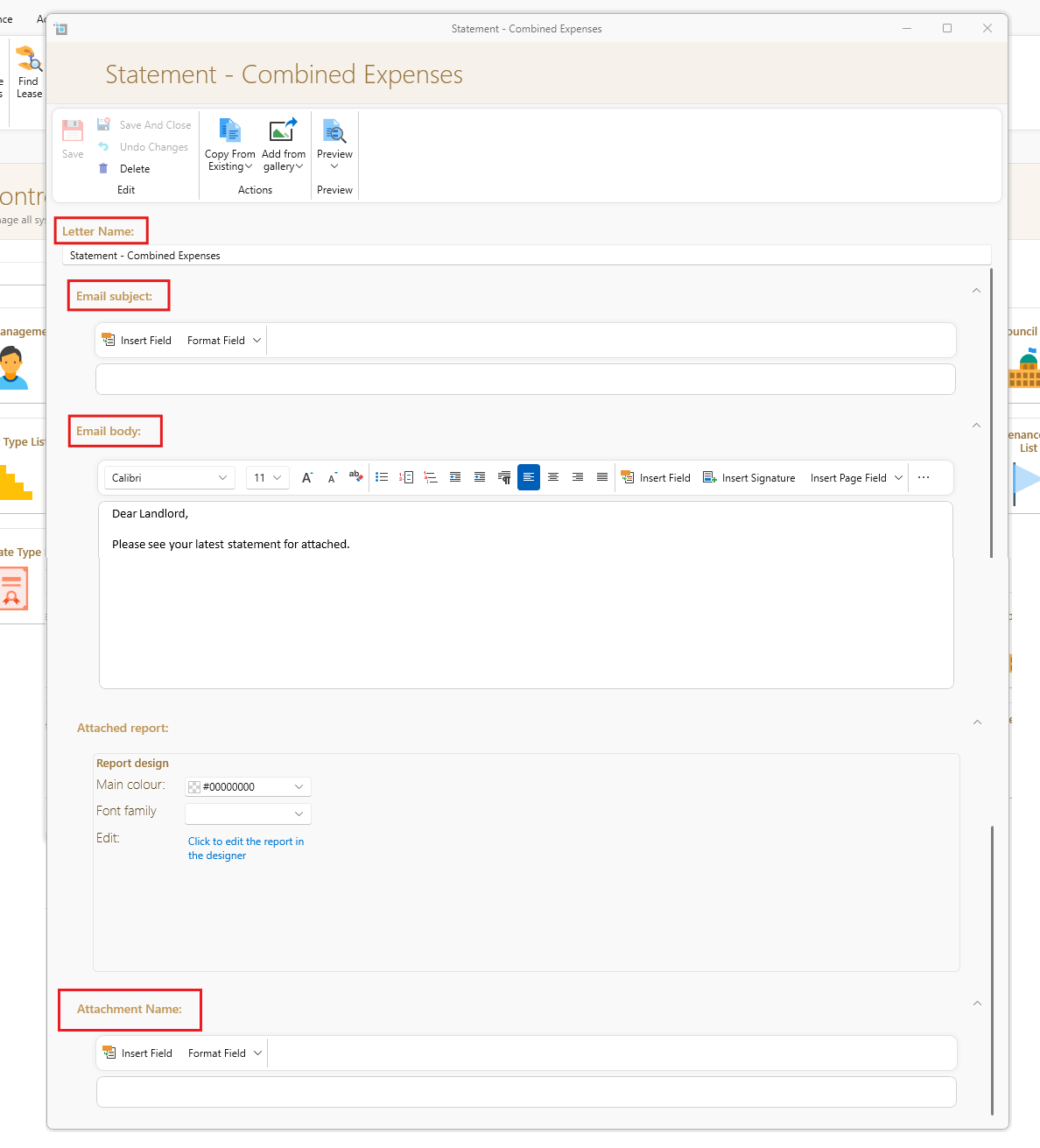 In addition, from this window, you can create new emails, letters, SMS messages, and reports. When creating new templates, you have the option to Add from the gallery or Copy from existing templates to meet your specific needs. Once done you can Save then Preview your template.