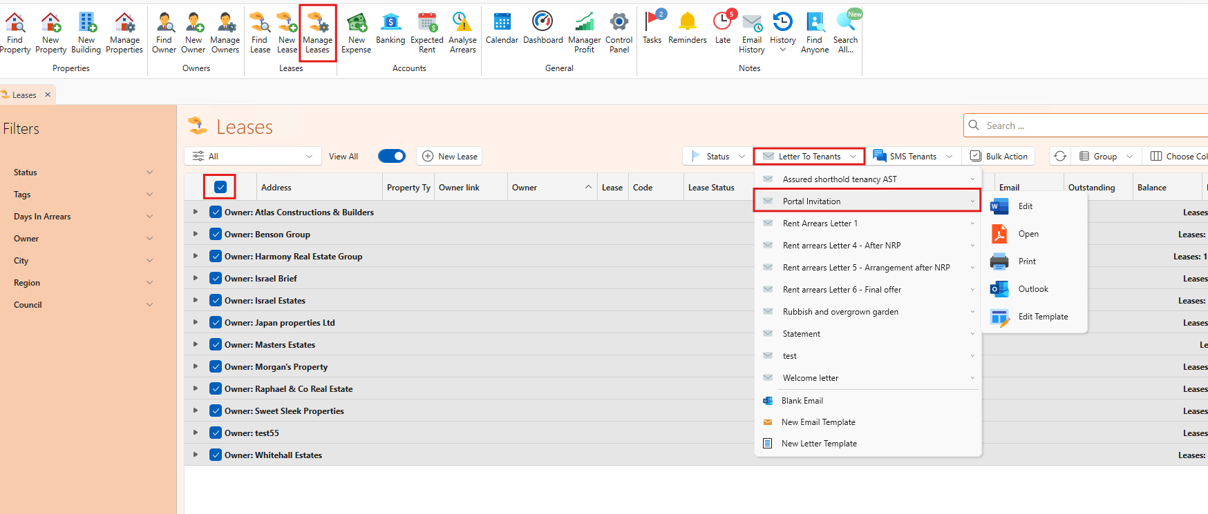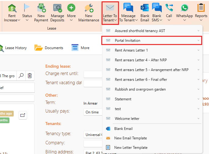 - Click on Letters to Tenants and choose Portal Invitation Letter.