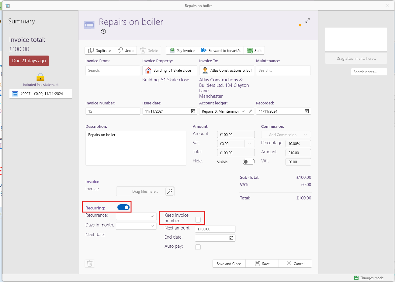 If an owner has an expense commission set on their page, both when dragging in and creating a quick invoice, the expense commission will be automatically added. This feature also works when charging the owner’s commission plus VAT on an invoice.