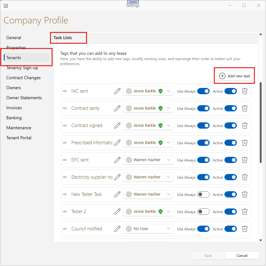 You can now customise the onboarding task lists for new tenants directly from the control panel and automatically assign them to a user within your system.