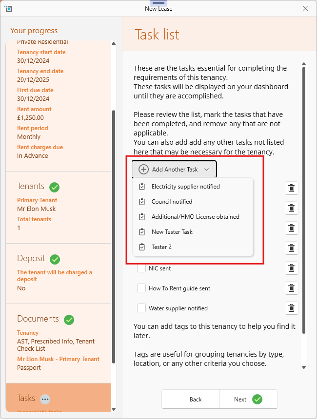 When creating new leases, the task list will be displayed like this: