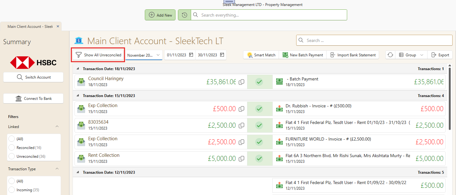 At the top of the window, you can filter to show either unreconciled transactions or those that are reconciled.