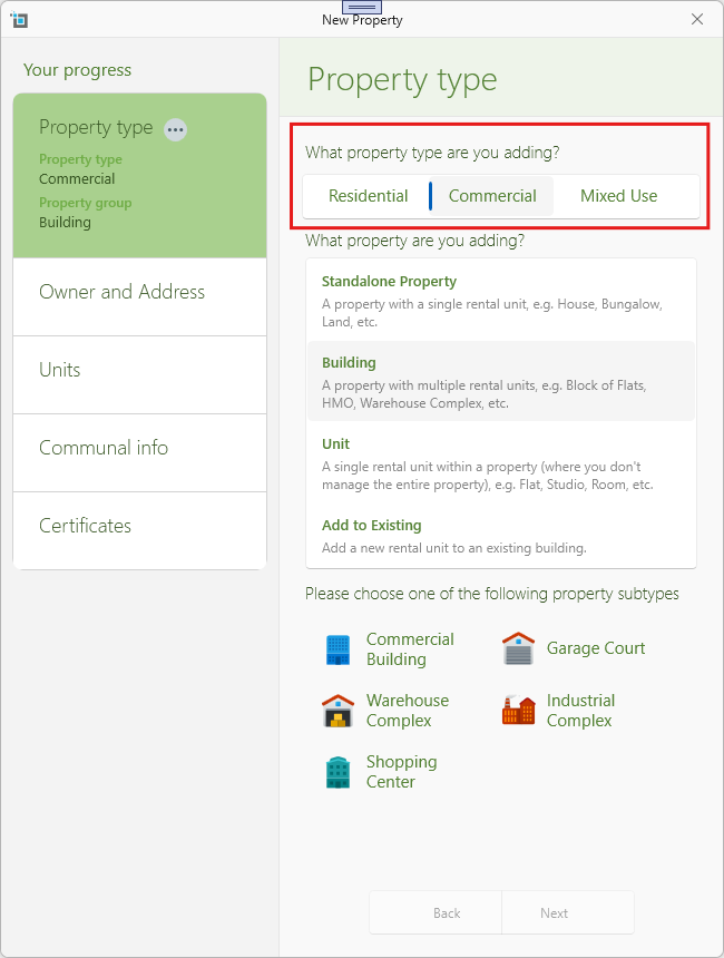 - Based on your selection, the system will provide relevant subtype options (e.g., apartment, office space, retail unit).