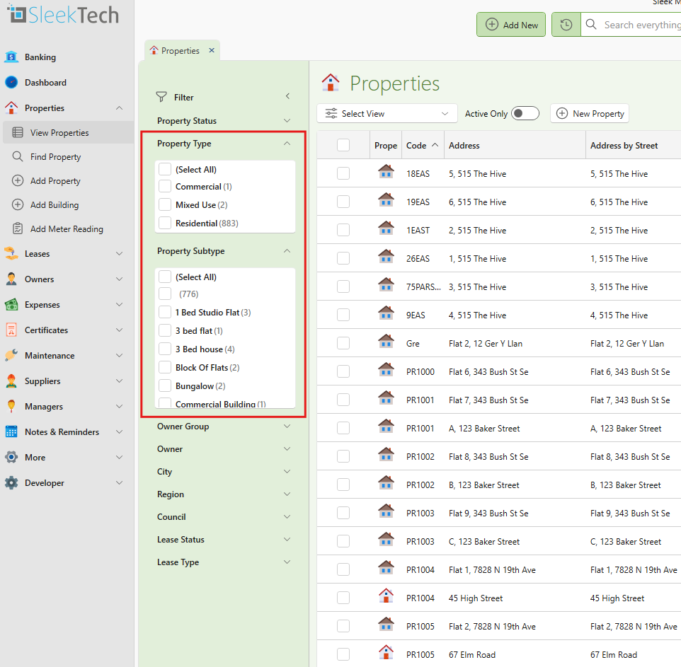 In the View Properties and View Leases pages, you will now be able to filter by Property Type (Residential, commercial etc.) and by Property Subtype (Flat, office , shop etc.)