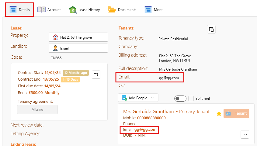 - Ensure email address is filled in correctly: Ensure that the relevant tenant, landlord, or supplier email address has been correctly entered in the Email Address field on the Details tab within SleekTech.