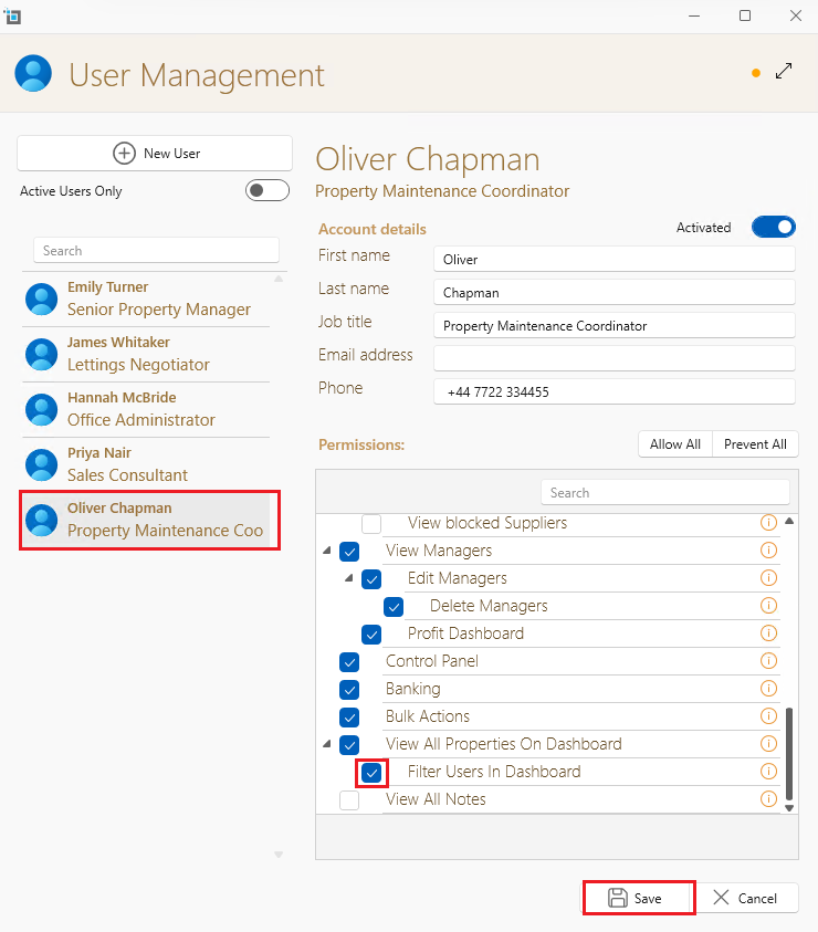 - The admin can additionally Uncheck View all properties on dashboard to limit visibility to only assigned properties